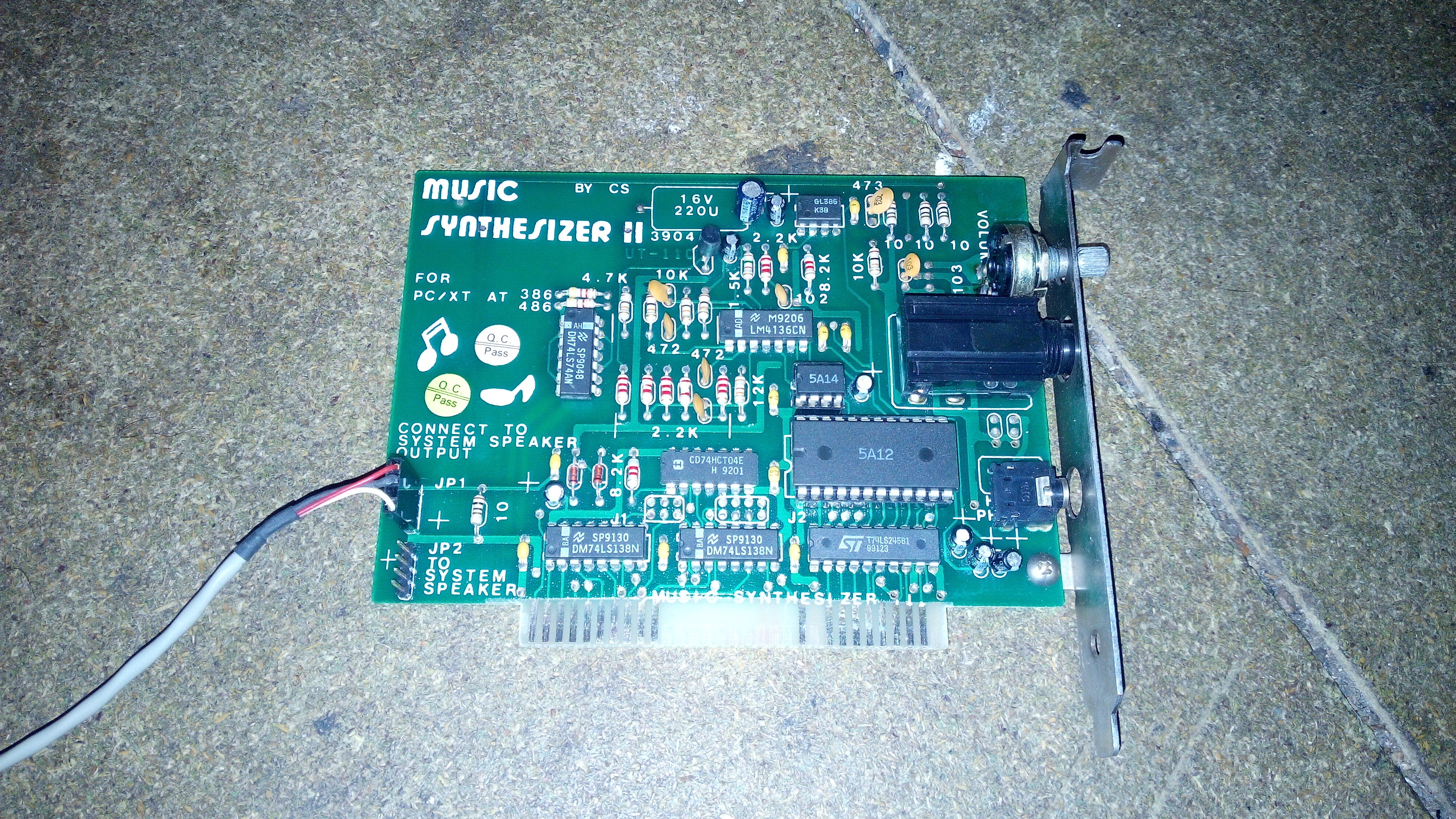AdLib cards were swiftly cloned and this is one of the earlier examples. Our card was made later, as evidenced by the hastily added '386' and '486' markings. Even the FM ICs are clones. This card has a nice added feature, in that you can input PC Speaker signals and also output the card back to the case speaker. |